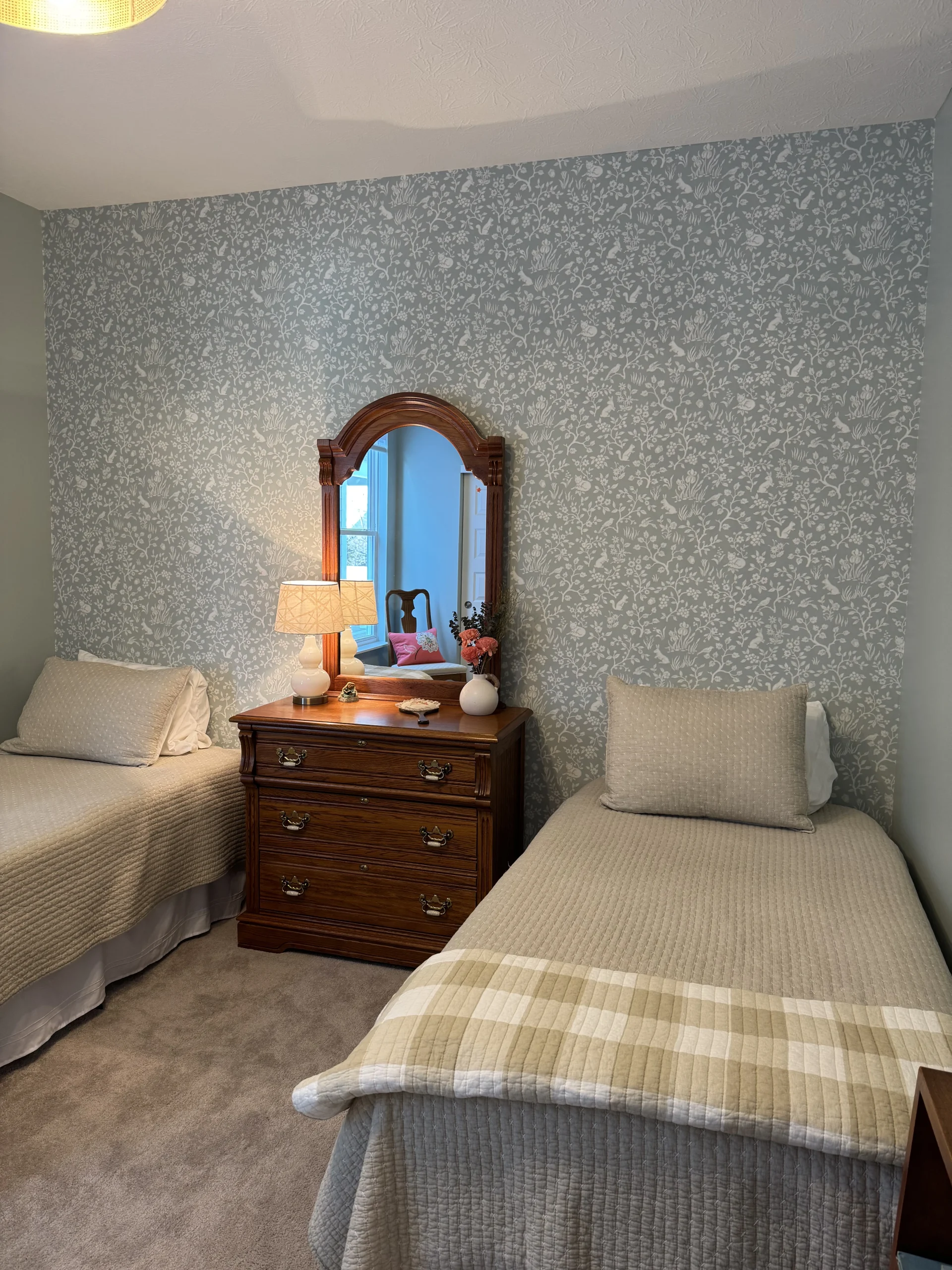Imagine stepping into a cozy bedroom where forest creatures come to life through enchanting wallpaper. The "Magnolia Home Fox & Hare Green" wallpaper by York Wallcoverings does just that. Inspired by whimsical stories and folklore, this wallpaper brings the charm of woodland creatures like foxes and hares to your child's bedroom in Westfield.
